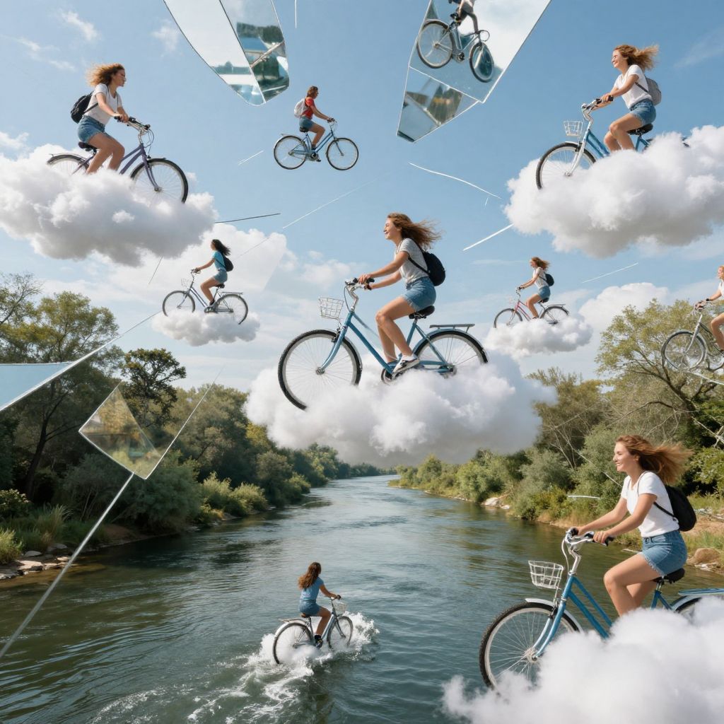 A river flows upward through a sky of shattered mirrors, reflecting infinite alternate versions of a single smiling woman riding bicycles made of clouds.