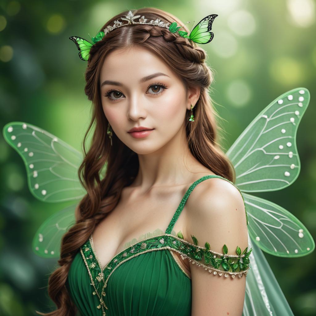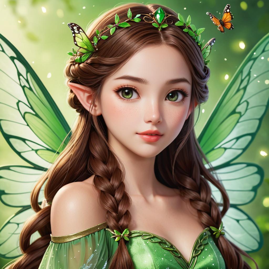 A highly detailed, realistic portrait of a young fairy with long brown braided hair, green eyes and delicate freckles. She wears a green off-shoulder dress adorned with leaf motifs and a matching green tiara decorated with gemstones and small leaves. The fairy has translucent green insect-like wings and is set against a soft, blurred green background with warm light. A small butterfly is flying near her head, enhancing the magical atmosphere.