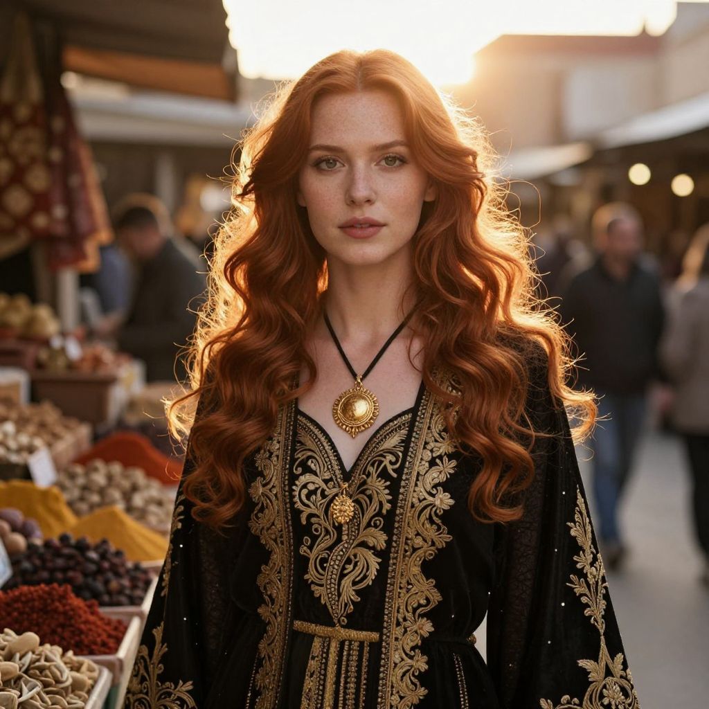 Photograph of a young Caucasian woman with long, wavy red hair, standing in a bustling outdoor market at sunset. She wears a black dress adorned with intricate gold embroidery and a matching gold pendant necklace. Her pale skin is lightly freckled, and she has a serious, focused expression. The background shows blurred market stalls with various colorful spices and goods, and people walking. The sunlight creates a warm, golden glow around her hair, enhancing the rich red color. The market setting and her elegant, traditional attire contrast with the modern, casual attire of the people in the background.