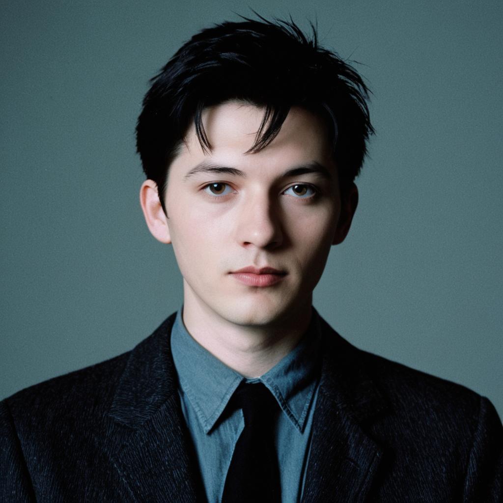 Portrait of a young man with short dark hair and pale skin wearing a dark slim blazer over a buttoned-up shirt, styled in 1980s British post-punk fashion reminiscent of Joy Division. The background is simple and blurred, emphasizing the subject.