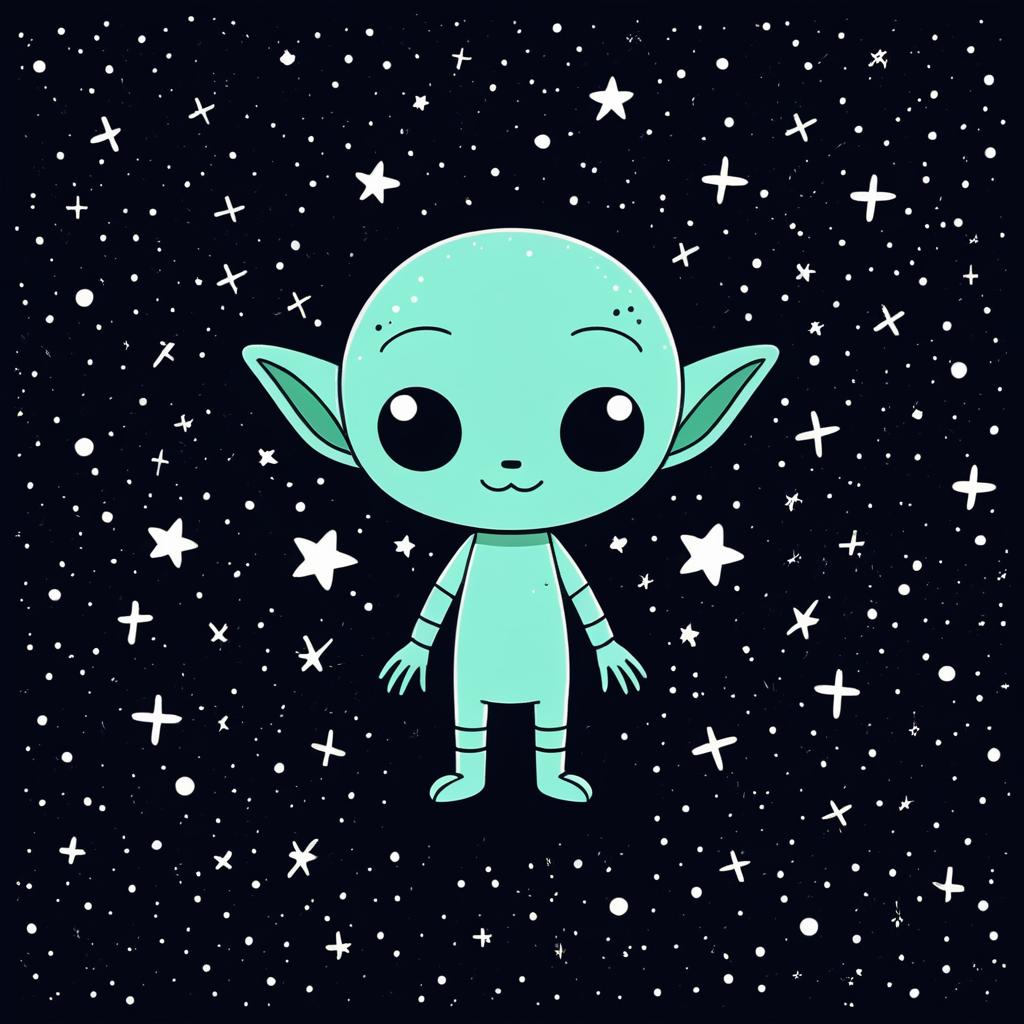 Simple cartoon illustration of a cute alien with large eyes and big ears, standing in outer space. The alien is light turquoise with minimalistic features and outlined with simple lines. The background is a dark galaxy filled with twinkling white stars in various shapes and sizes, giving a playful and charming look.