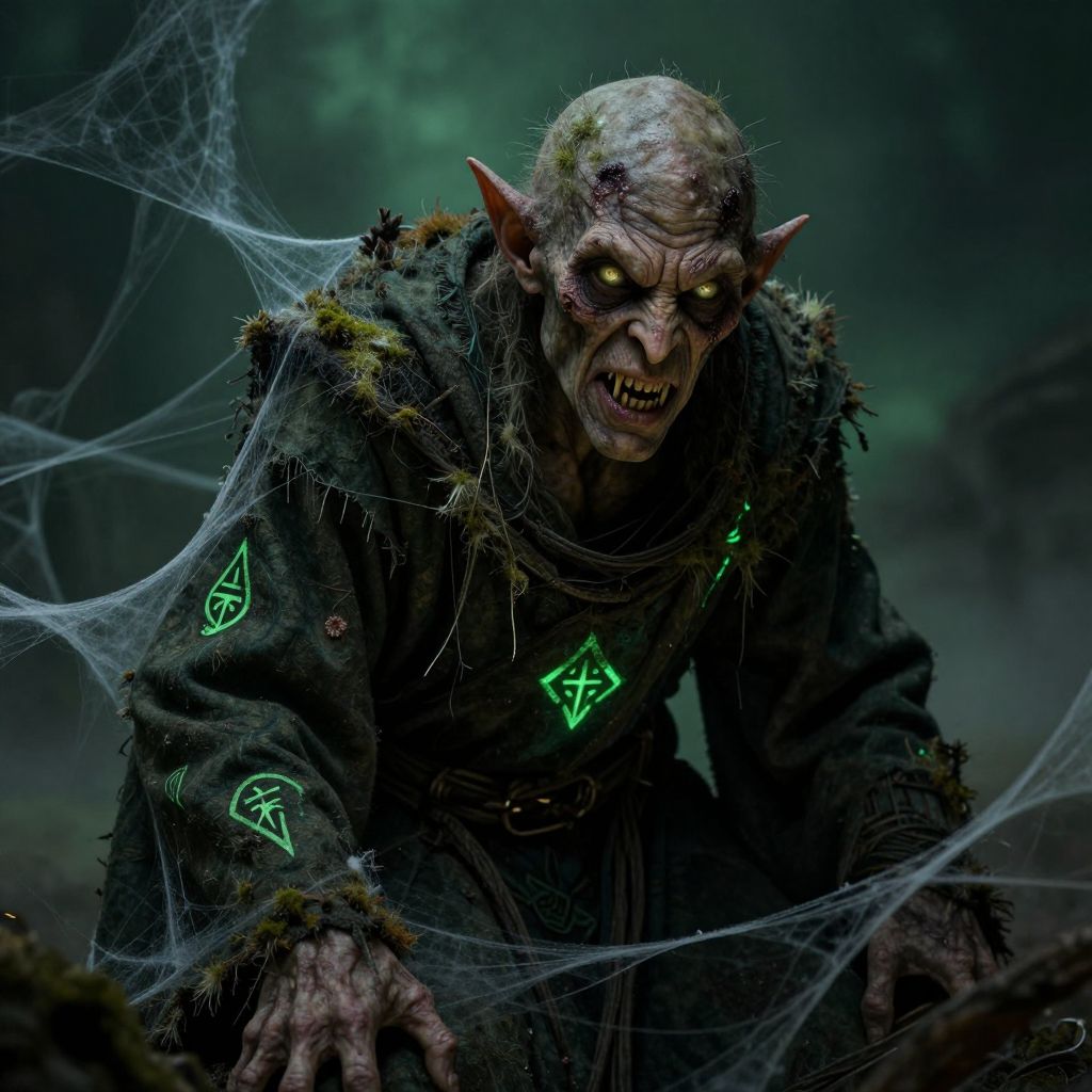 A dark, digital CGI illustration depicts a menacing, humanoid creature with sharp teeth bared in a snarl. The creature has pale, decaying skin, pointed ears, and wears a tattered, dark hooded cloak. Its face is smeared with dirt and blood, and droplets of water cling to its skin. The background is a blurry, dark green forest, adding to the eerie atmosphere. The creature's eyes are not visible, enhancing its frightening appearance. The overall color palette is dark and moody, emphasizing the creature's sinister nature.