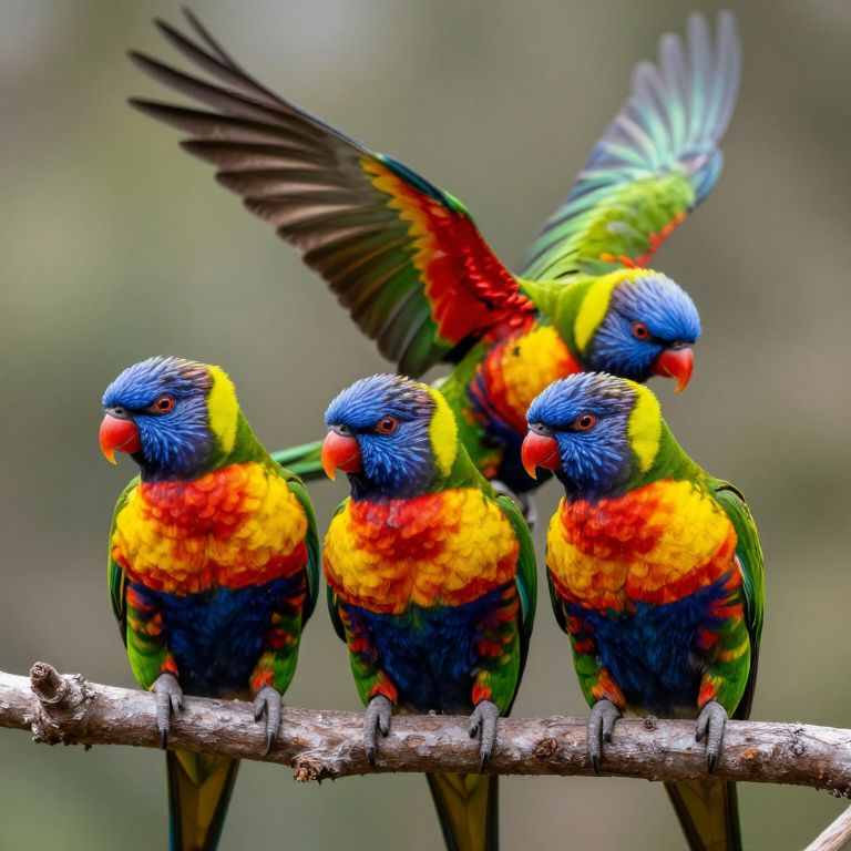 Three vibrant rainbow lorikeets perched on a tree branch, with one spreading its wings, showcasing their striking colors and intricate details.