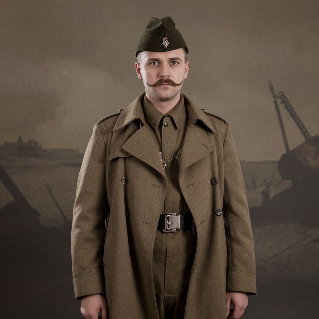 The image depicts a man dressed in a military uniform, reminiscent of World War I attire, with a trench coat and a hat adorned with a band. His mustache is thick and well-groomed, adding to his distinguished appearance. The background features a textured, almost abstract design with shades of brown and gray, suggesting a battlefield or a war-torn environment. The overall composition is balanced, with the man centrally positioned, and the background elements providing depth and context to the scene. The colors are muted, with earthy tones dominating the palette, enhancing the historical and somber atmosphere of the image.