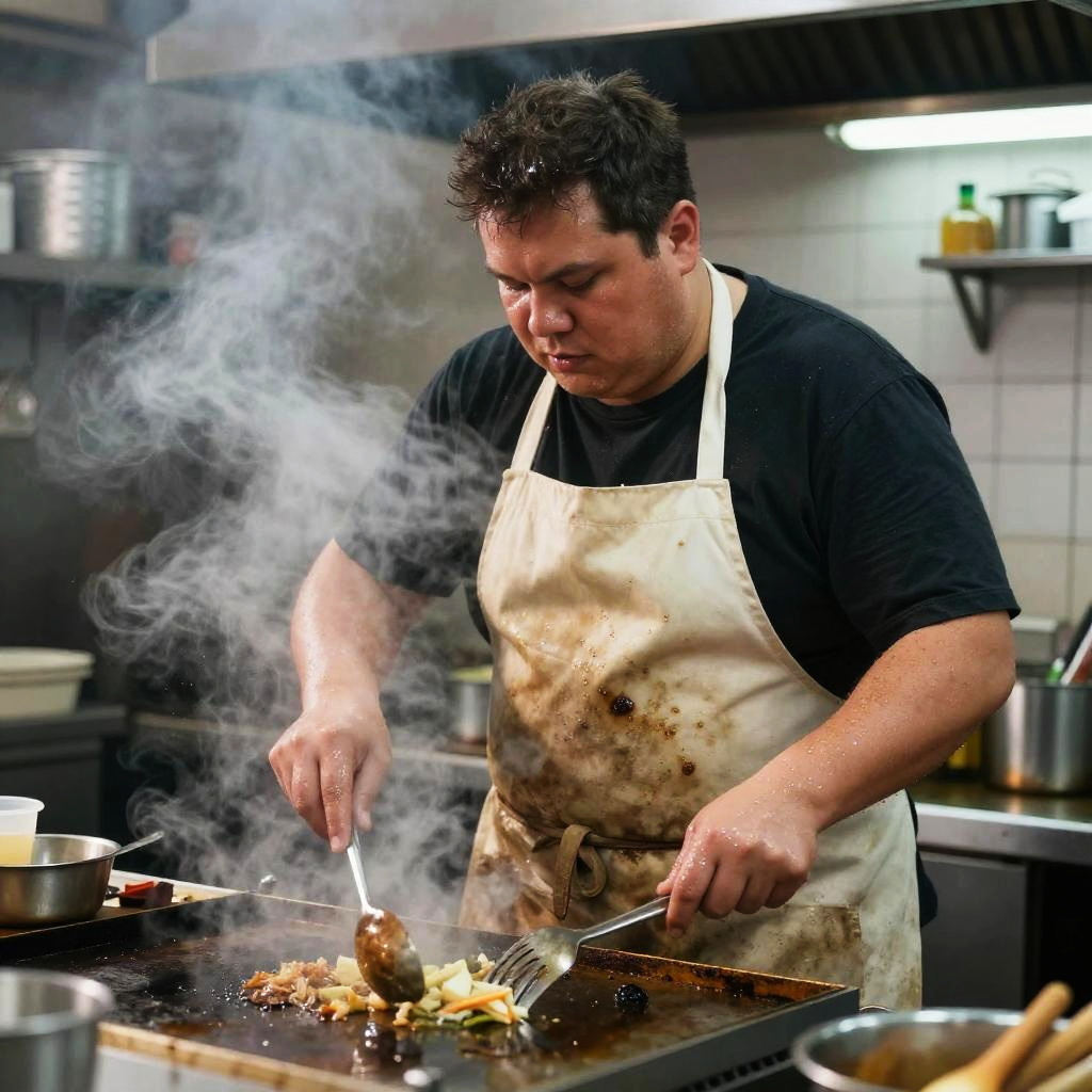 Fat greasy man working as a cook in a small greasy spoon diner, intense focus cooking on a griddle, wearing a stained apron, steam and smoke filling the air, semi-realistic style with detailed grease stains and textures, dynamic lighting highlighting the warmth of the kitchen.