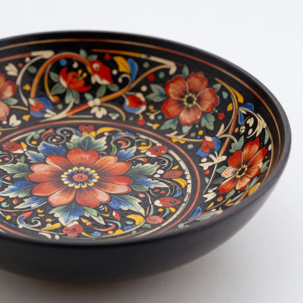 Elegant rosemaling design on a curved wooden bowl, detailed floral scrolls and stylized blossoms in vivid reds, blues, and yellows, handcrafted folk art, textured background, soft focused lighting emphasizing the fine brush detail and cultural heritage