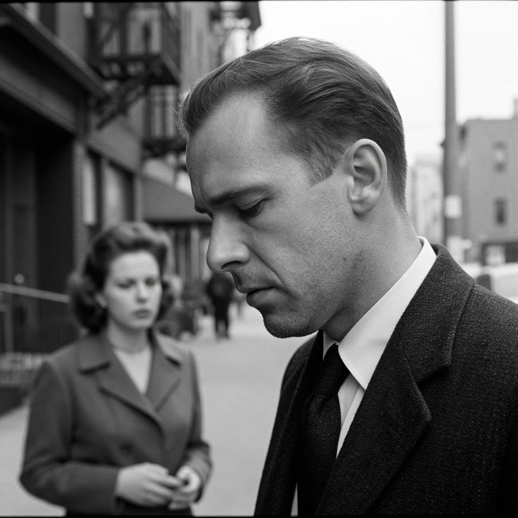 A black and white portrait of a man with a distinct jawline, expressing guilt and sorrow, with a woman in the background, set in a 1970s New York street, with elements of Fritz Lang's Hammer Studio film style and German expressionism.