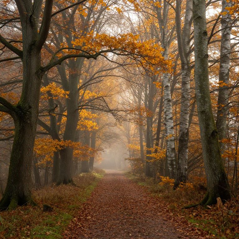 Midlands during autumn, a dense forest with towering oak and birch trees shedding golden leaves, a narrow winding path covered in foliage, mist rising in early morning light, serene and peaceful mood, ultra detailed, cinematic depth of field.