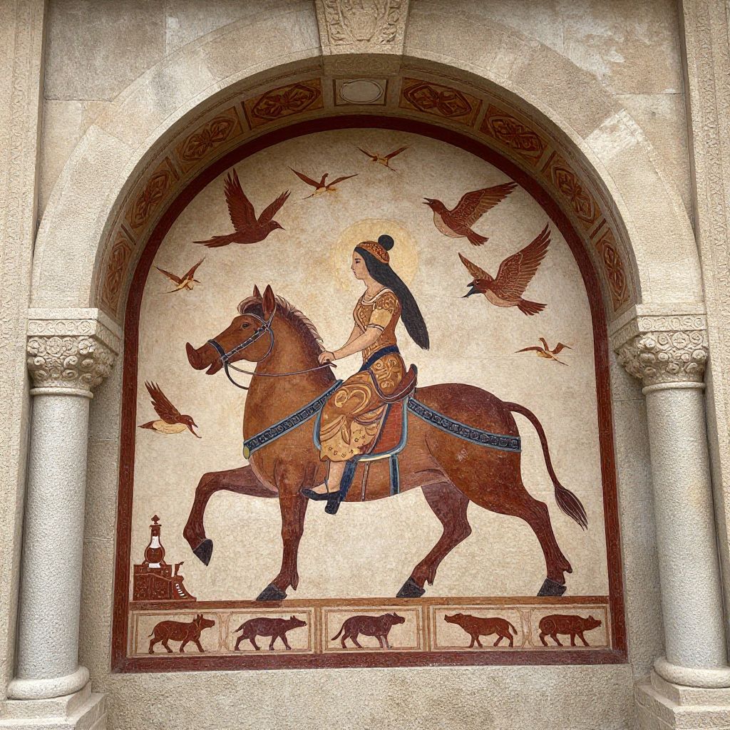 Mural depicting a woman riding a mythical creature composed of a horse and a boar, surrounded by flying birds, is intricately painted on the wall of an ancient stone archway, flanked by ornate columns and decorative patterns featuring silhouettes of various animals.