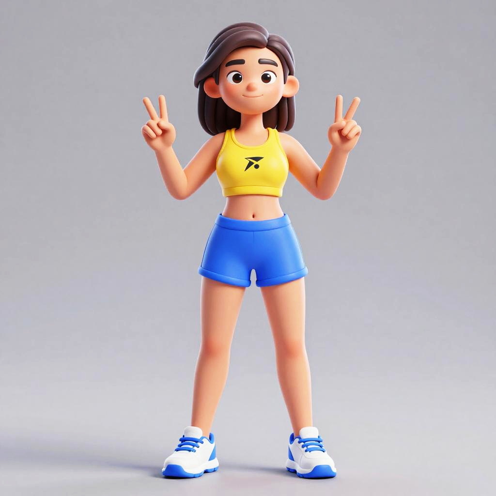 3D digital cartoon of a smiling girl with brown hair, wearing a yellow crop top, blue shorts, white and blue sneakers, and making double peace