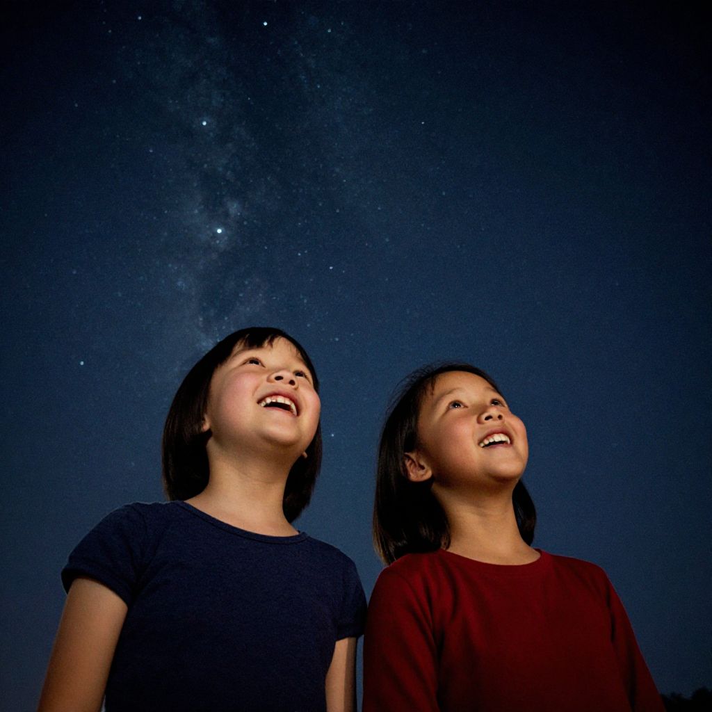 Photograph of two young Asian children, a girl in a dark blue shirt and a boy in a maroon shirt, standing side by side against a night sky filled with stars. Both children have short black hair and are smiling upwards with their heads tilted back, gazing at the starry sky. The Milky Way is visible, adding a cosmic glow to the dark blue background. The image captures a sense of wonder and joy, with the children's expressions and the starry backdrop creating a magical, serene atmosphere. The lighting highlights their faces and shirts, contrasting with the dark sky.