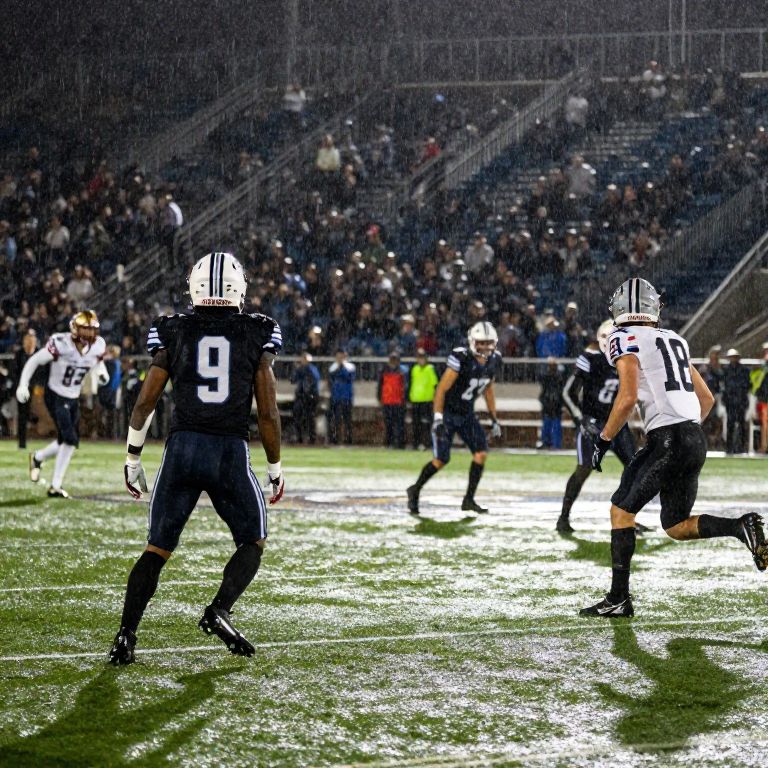 Football field at night during a rainy game, slick wet grass reflecting lights, players in motion with rain droplets, blurred crowd in dim lit stands, dynamic energy