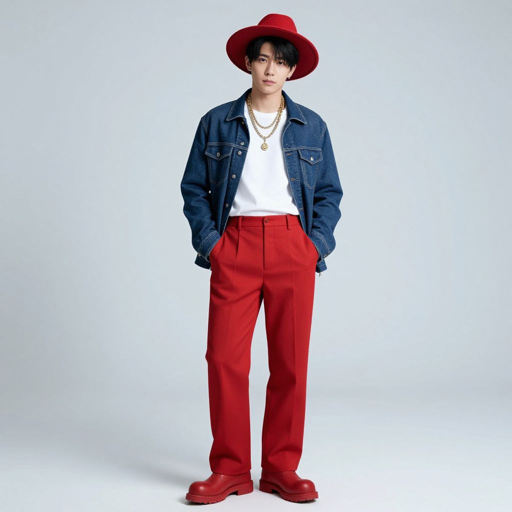 Chalupa loteria costume, 1boy, male focus, solo, hands in pockets, hat, necklace, jewelry, full body, red footwear, pants, looking at viewer, black hair, shoes, jacket, standing