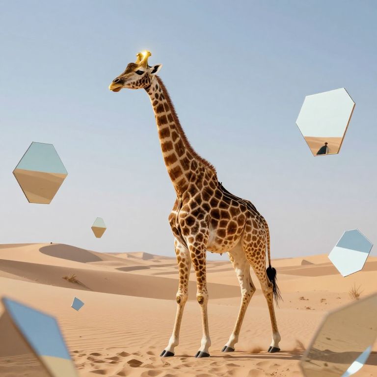 A clockwork giraffe with glowing brass antlers walks through a desert of floating mirrors, each reflecting alternate histories and possible futures.