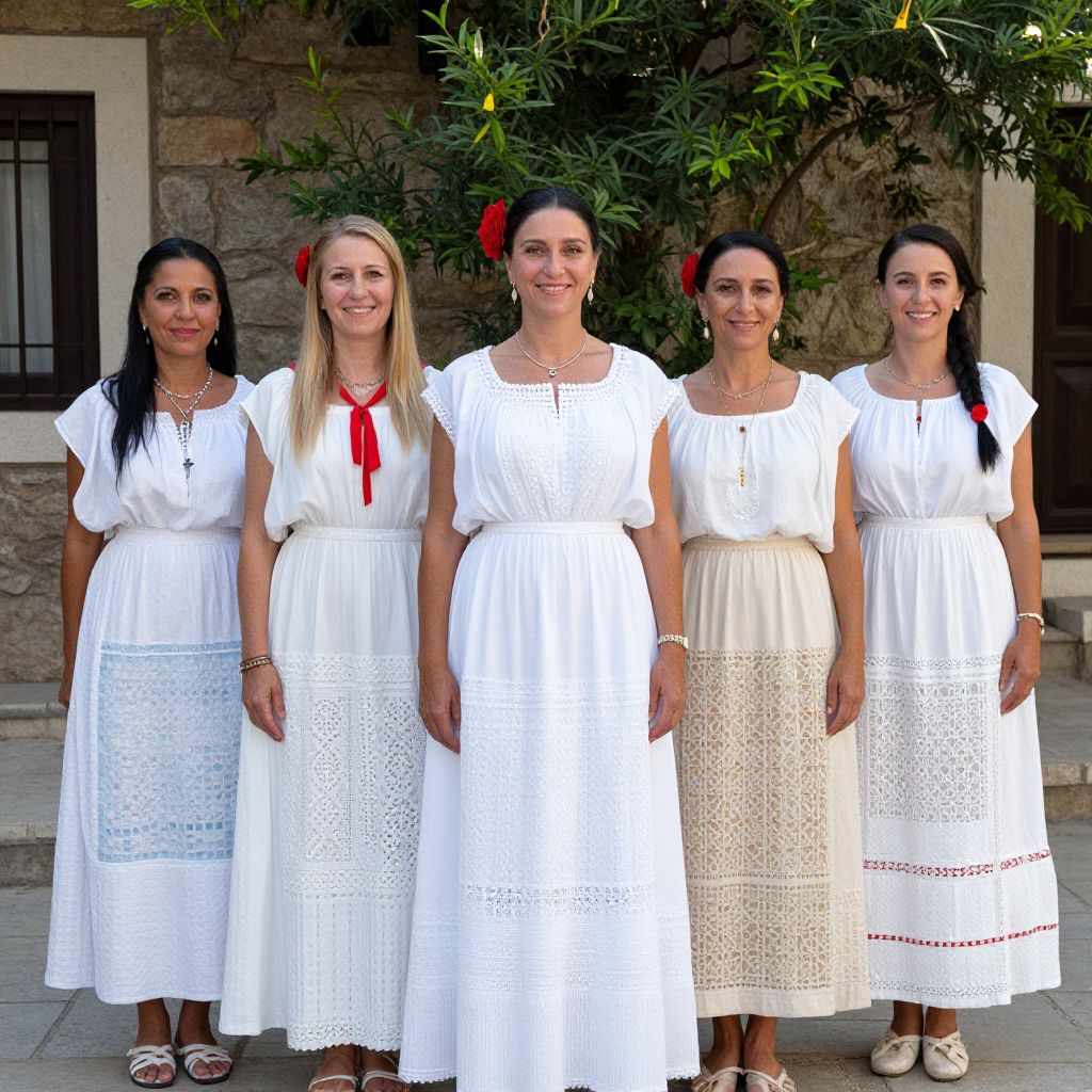Greek costume ladies, woman in a white dress with a red flower in her hair
