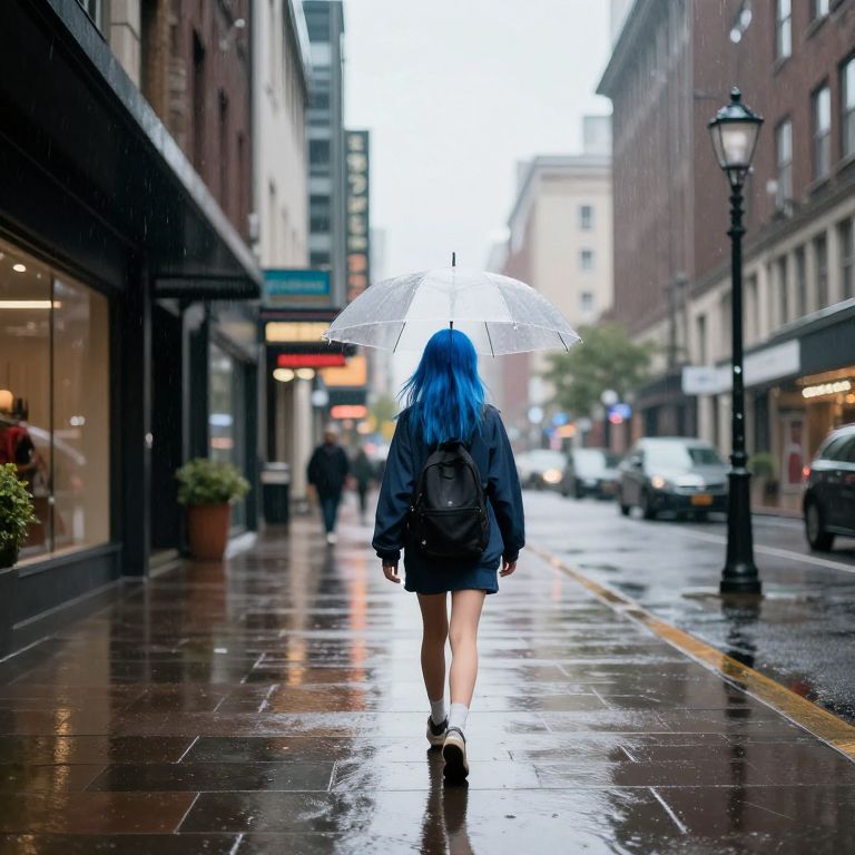 Wide-Angle Sports Photography young girl, explore the city by walking away, blue hair, rain, 8k , details highligh, high lighting, colourful, 16k,