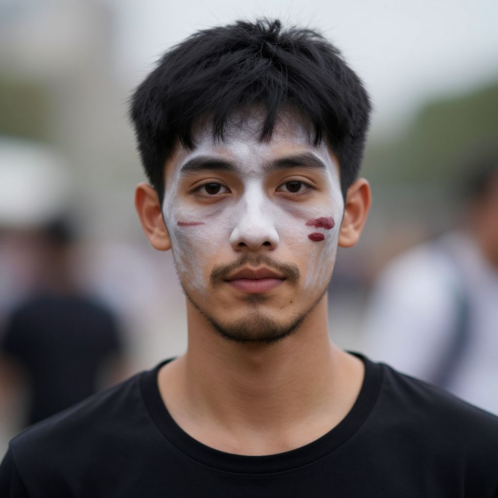 Photograph of a young Asian man with black hair, white face paint, and red markings on his cheeks, wearing a black shirt, standing outdoors with