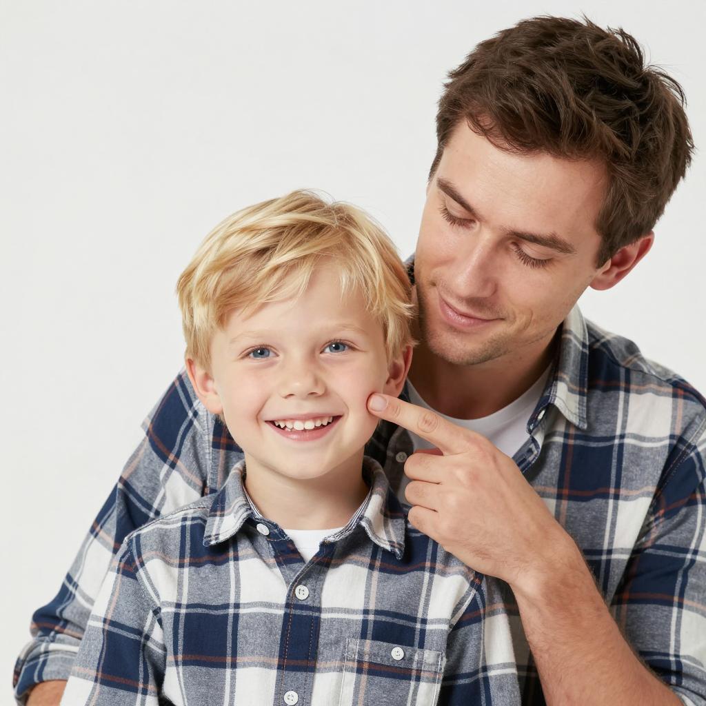 A blonde child with light skin and a bright smile, pointing at their cheek. A man with dark hair, light skin, and a slight smile stands behind, resting his head on the child's shoulder. Both wear plaid shirts. White background.