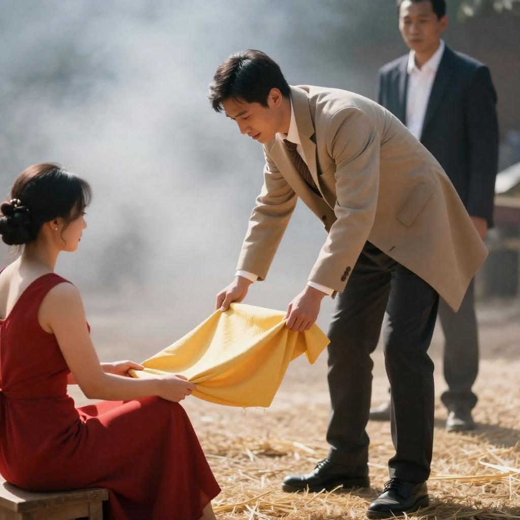 Photograph of a woman in a white, flowing wedding dress running away from a black vintage car on a deserted, grassy road. A man in a brown suit and hat chases her from behind. The background features dry, tall grass and distant trees under a cloudy sky.