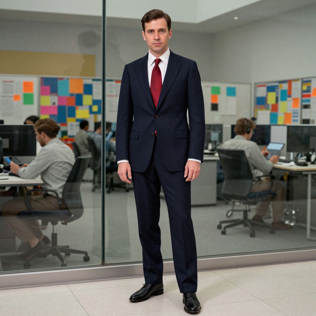 Photograph of a young Caucasian man with short, dark brown hair, standing confidently in the center of a modern office. He is wearing a dark pinstripe suit, white dress shirt, and a maroon tie. His black leather shoes are polished. The office background features glass walls reflecting the room, with multiple desks and office chairs occupied by people working on computers. The walls are adorned with colorful, patterned bulletin boards. The floor is tiled in a light gray color, and the overall atmosphere is professional and contemporary.