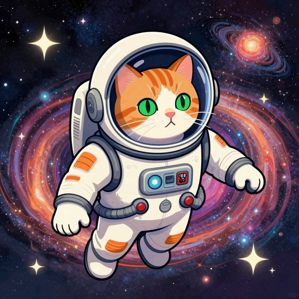 Cartoon cheetah in white spacesuit waving under a starry night sky, with two bright stars in the background. Cute, digital art style