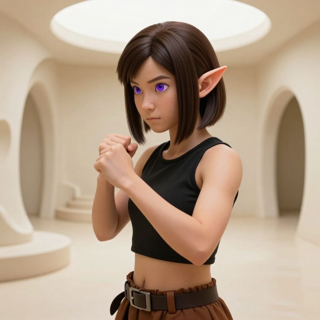 ASCIILapanya, 1 person, pointy ears, side view, 3 fingers 1 thumb, ((snout nose)):1.2, flat chest, close-up, olive-tone skin, tall, square jaw, violet irises, dark brown hair, chin-length hair, straight bob haircut parted in the middle, athletic build, small nostrils, black sleeveless tunic, brown breeches, belt((sparring pose, fighting pose))Midriff, body hair, belly hair, armpit hair, ((happy trail))((indoors, vertical chamber, cavern, organic room, rounded floors, curved walls and doorways, ramps leading upward, polished floors and walls, smooth walls, clean walls, clean ceiling, cream colored)), clean lines, highly detailed, high quality, ((semi-realistic)), best quality, rating: g score_9, score_8_up