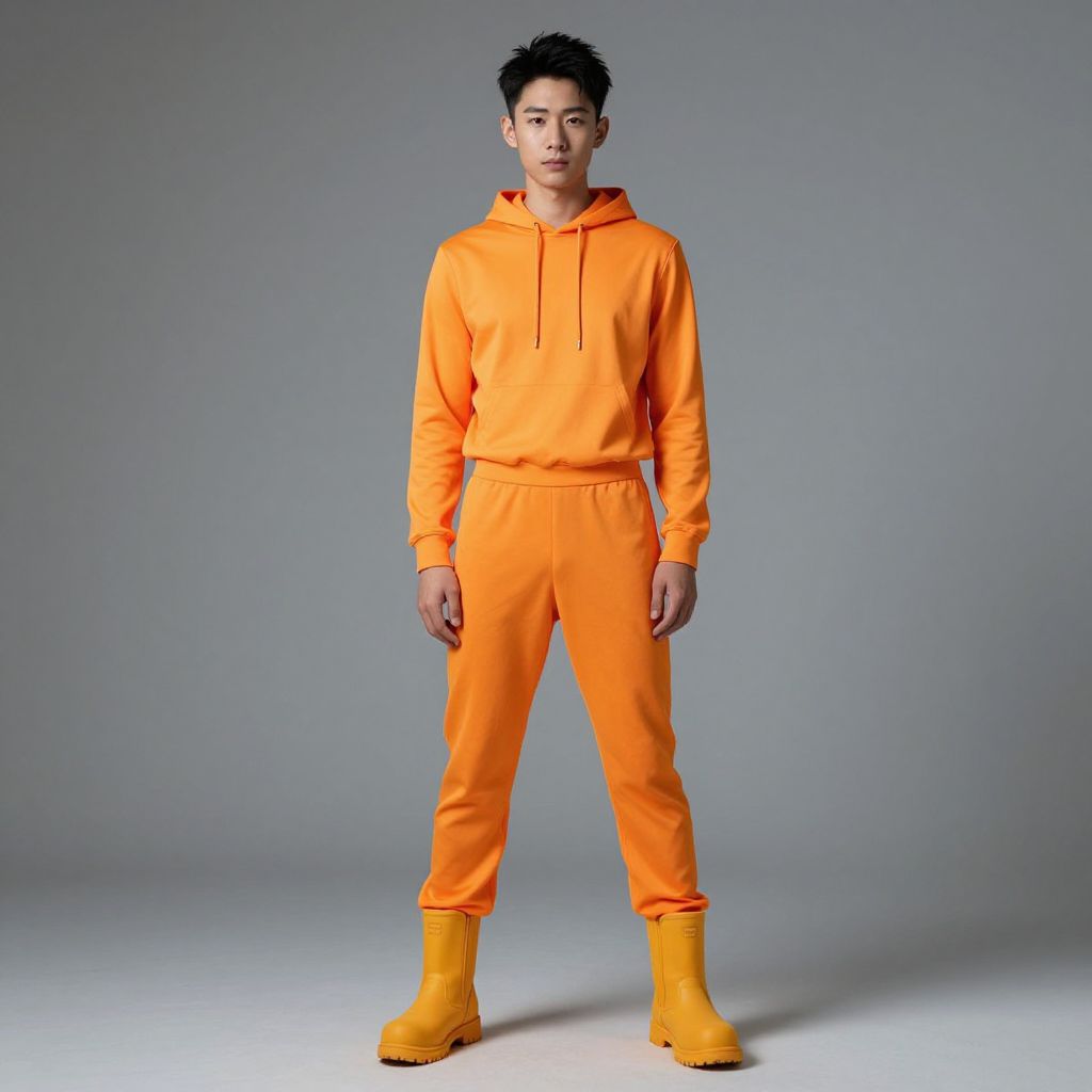 Photograph of an Asian male model standing against a plain gray background. He has short, spiky black hair and a neutral expression. He is wearing a bright orange hooded sweatshirt with matching orange pants, paired with yellow rubber boots. The sweatshirt has a drawstring at the neckline and the pants are loose-fitting. The model's stance is relaxed, with his arms by his sides. The lighting is even, highlighting the vivid colors of his outfit. The overall style is casual and contemporary.
