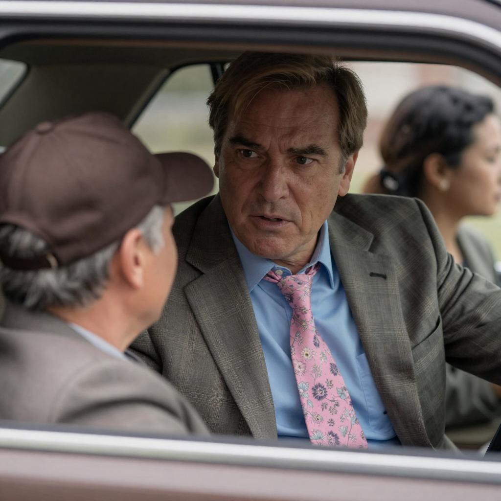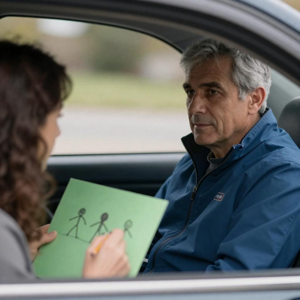 Photograph of a middle-aged man with short gray hair, wearing a blue jacket, driving a car, looking to his left. A woman with curly brown hair, holding a green drawing with stick figures, peers through the car window. Her right hand holds a pencil. The man's expression is neutral, the woman's expression is focused. The background shows a blurry outdoor scene.