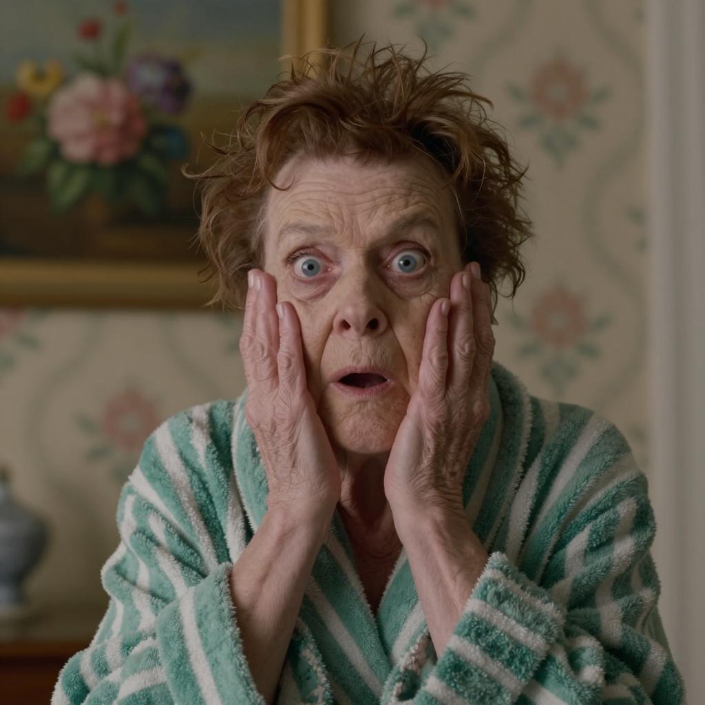 Old woman with gray hair in a loose bun, wearing a blue and white plaid blouse with a lace collar, standing indoors. Background includes a window with green foliage outside, and beige curtains. Her mouth is slightly open, expressing concern or surprise. Soft, natural light illuminates her face. One wall-mounted object is partially visible on the left.