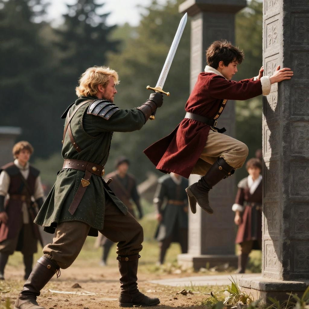 Photograph of an action scene. Blonde man in green and brown armor attacks from the left, sword raised. Brown-haired boy in red coat and beige pants jumps between two patterned towers. Forested landscape in background. Intense expressions. Multiple people.