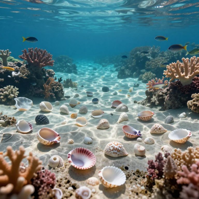 Imagine an enchanting underwater world where delicate seashells resembling blossoming flowers are gracefully scattered across the serene depths, reminiscent of Georgia O'Keeffe's floral masterpieces. From above, vibrant coral reefs and mesmerizing schools of fish weave together in a tapestry beneath the surface, while sunlight filtering through the water casts dappled shadows, creating a sense of calm introspection. This captivating subaqueous landscape celebrates the grace and intricate beauty of nature's hidden realm, inviting viewers to marvel at its ethereal allure.