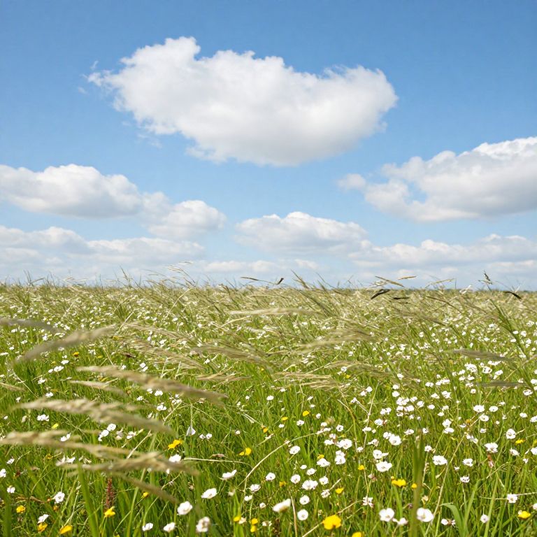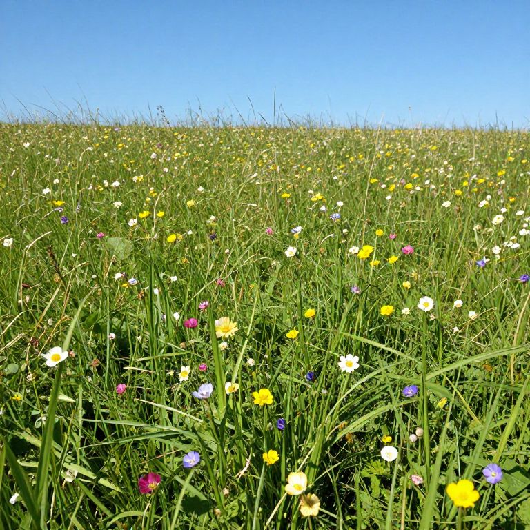 A sunny meadow bursting with wildflowers and green plants, highlighting the vivid colors and natural textures under a clear blue sky.