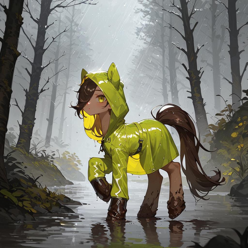 Score_9, score_8_up, score_7_up, score_6_up, score_5_up, score_4_up, feral pony, pony, stallion, male pony, 1 boy, solo, earth pony, feral, golden yellow fur, long dark brown mane, long hair, sideswept bangs, one eye covered, long dark brown tail, lanky, fluffy, yellow eyes, green raincoat, long raincoat, hood, hood up, ears covered by hood, green rubber boots, heavy rain, downpour, overcast, forest, path, mud, walking, side view, looking at viewer, wet, dripping, summer