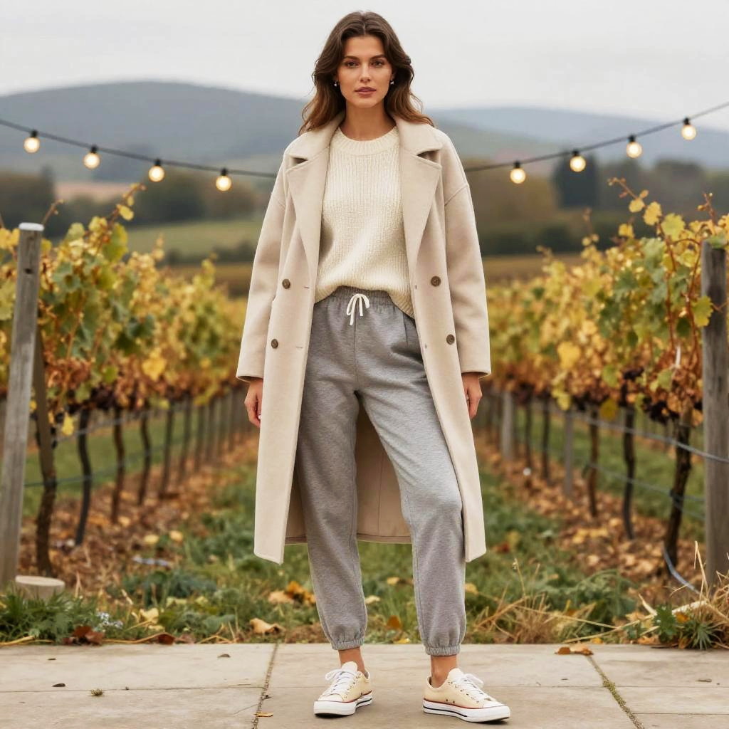 Slim woman with long brown hair wearing a beige oversized wool coat over a ribbed cream knit sweater tucked into gray tapered sweatpants. She completes her casual chic look with cream low-top sneakers. She stands on a stone path in a vineyard with string lights overhead and autumn-colored grapevines around her.