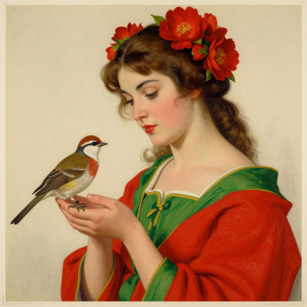 A vibrant digital art print in the style of Georges Lepape, showcasing a woman adorned with red flowers in her hair, wearing a striking red garment with green accents, as she tenderly holds a small bird perched on her hand, rendered with meticulous detail and a vintage aesthetic.