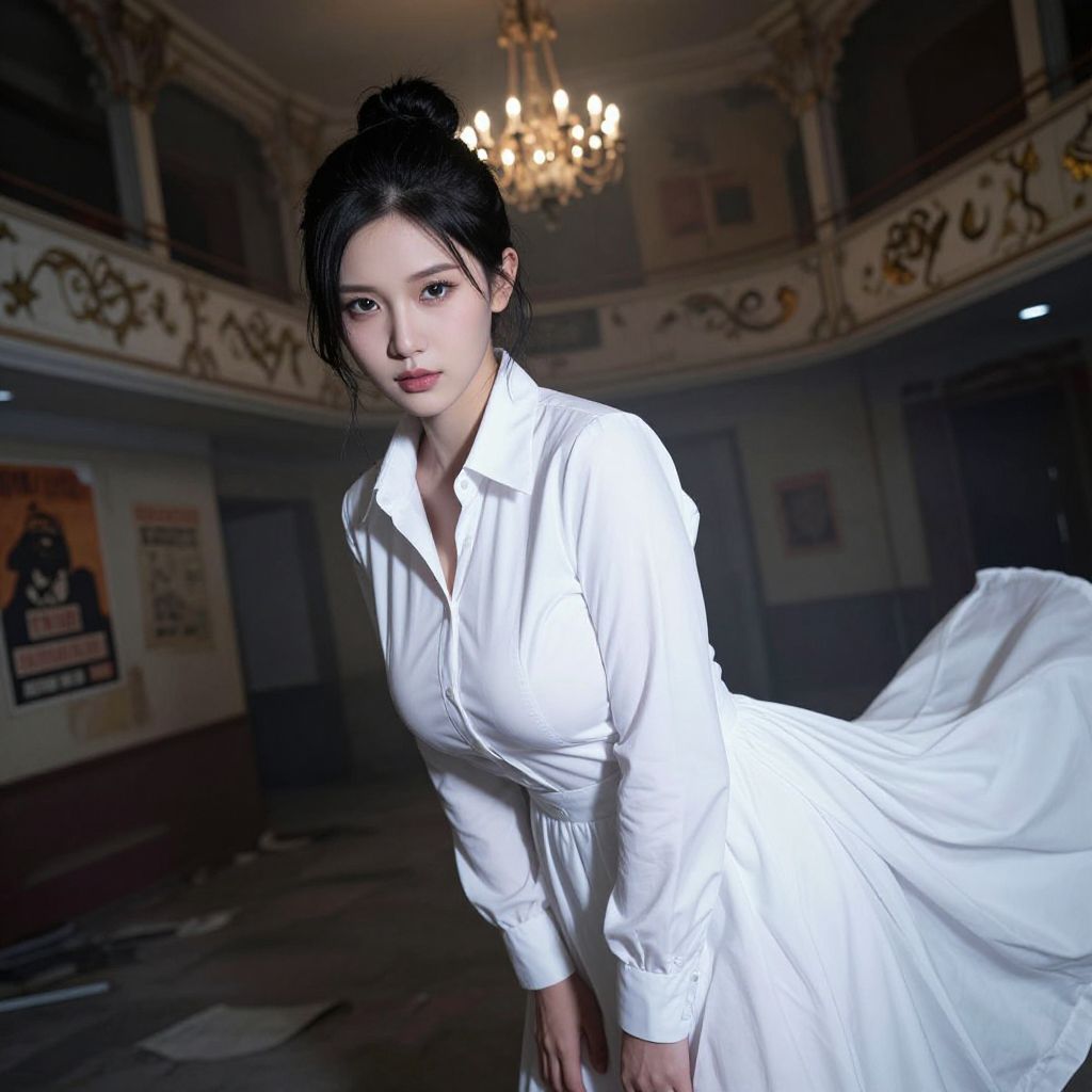 A mysterious woman with high cheekbones, sharp features, and a calm, enigmatic expression wears a dramatic white shirt dress costume as part of a Halloween-themed event, set in a foggy abandoned theater with old posters and eerie chandeliers, the white dress flowing like water, highlighting her silhouette as she leans into the camera, eyes locked with the viewer in a secretive stare.. The woman has big tits and cute face