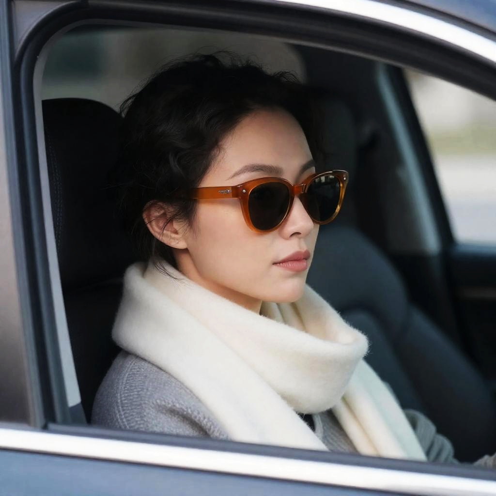 Photograph of a woman with fair skin, dark curly hair in an updo, wearing large amber sunglasses, a white scarf, and a gray sweater. She is looking out of a car window with a shadowed background. Her expression is neutral. The car window frame is metallic and dark blue.