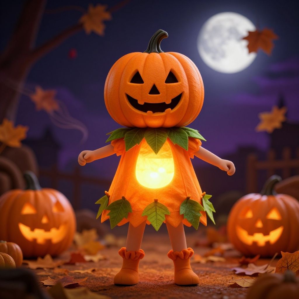 Ula Halloween costume portraying a playful pumpkin sprite with a glowing orange outfit, leafy green accents, and a mischievous smile, surrounded by carved jack-o'-lanterns and swirling autumn winds under a harvest moon, colorful and lively.