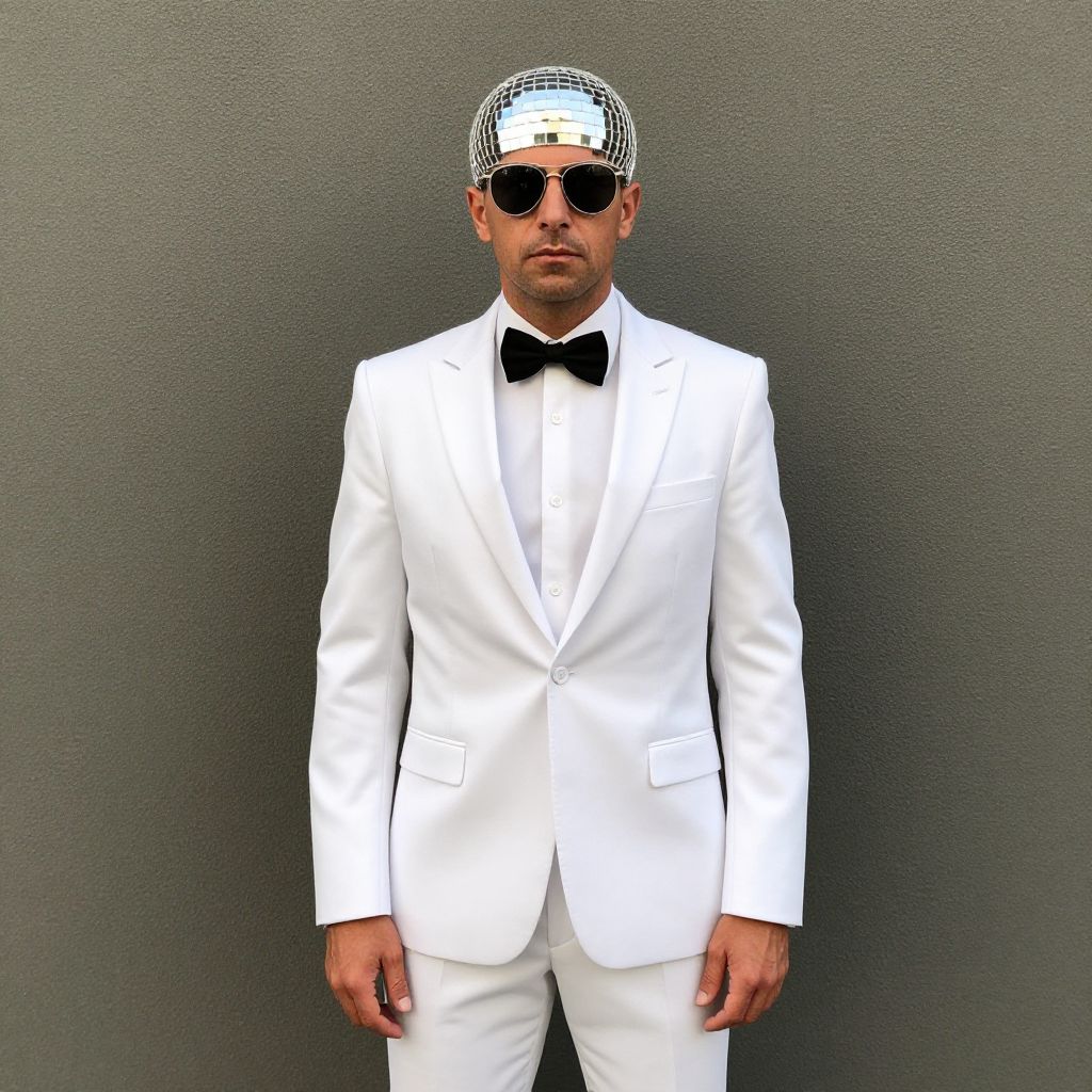 Man Disco King Costume, man in a white suit and sunglasses standing in front of a wall