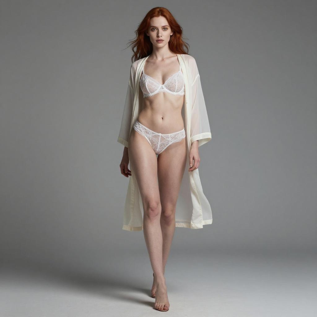 Red-haired Woman in White Lingerie and Sheer Robe