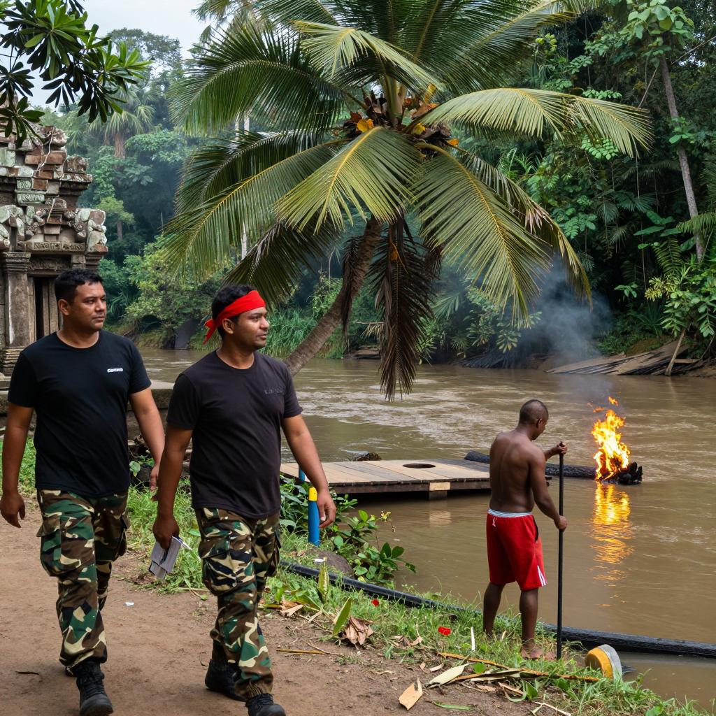 Black-and-white photograph of three men in the foreground standing on a flooded riverbank. Two men lean against a tree on the left, one man stands with hands on hips in the center. All wear "Calamity Flood Control" shirts and pants. Trees and branches partially obscure the background. Water covers the ground. The men have short hair, and their backs are to the camera.