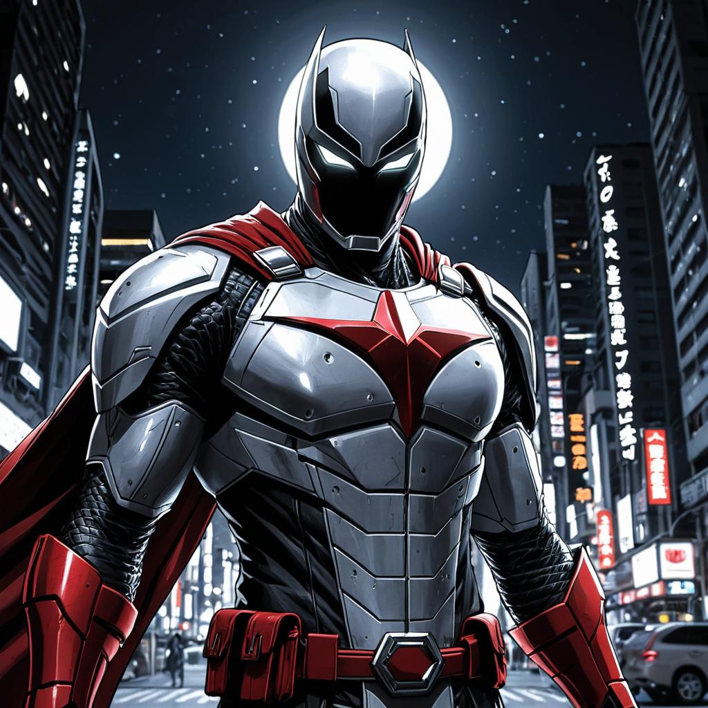 A highly detailed digital portrait of a futuristic armored knight wearing a sleek silver and red suit with glowing eyes and a red cape. The character is centered against a nighttime cityscape illuminated by neon signs and a full moon, with intricate armor details and volumetric lighting effects emphasizing a dramatic and heroic atmosphere. The setting appears modern urban, inspired by manga and comic book art styles.