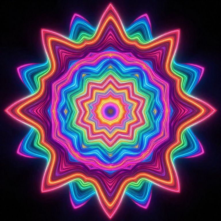 An abstract neon mandala with vibrant colors and intricate patterns.