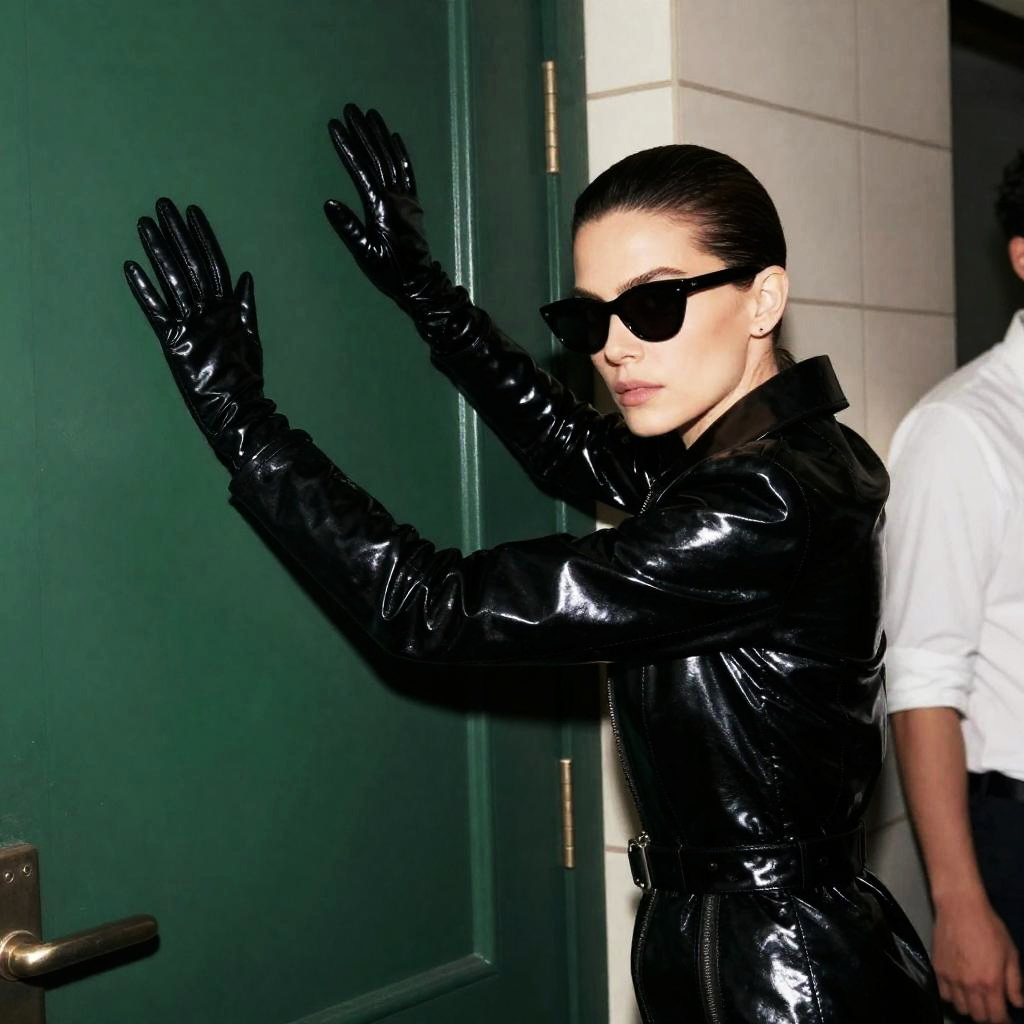 Photograph of a woman with slicked-back dark hair, wearing black sunglasses, a shiny black vinyl jacket, and matching black vinyl gloves. She is pressing her hands against a green door, arms extended. A partially visible man in a white shirt is on the right, leaning against a tiled wall. Intense expression on the woman's face.