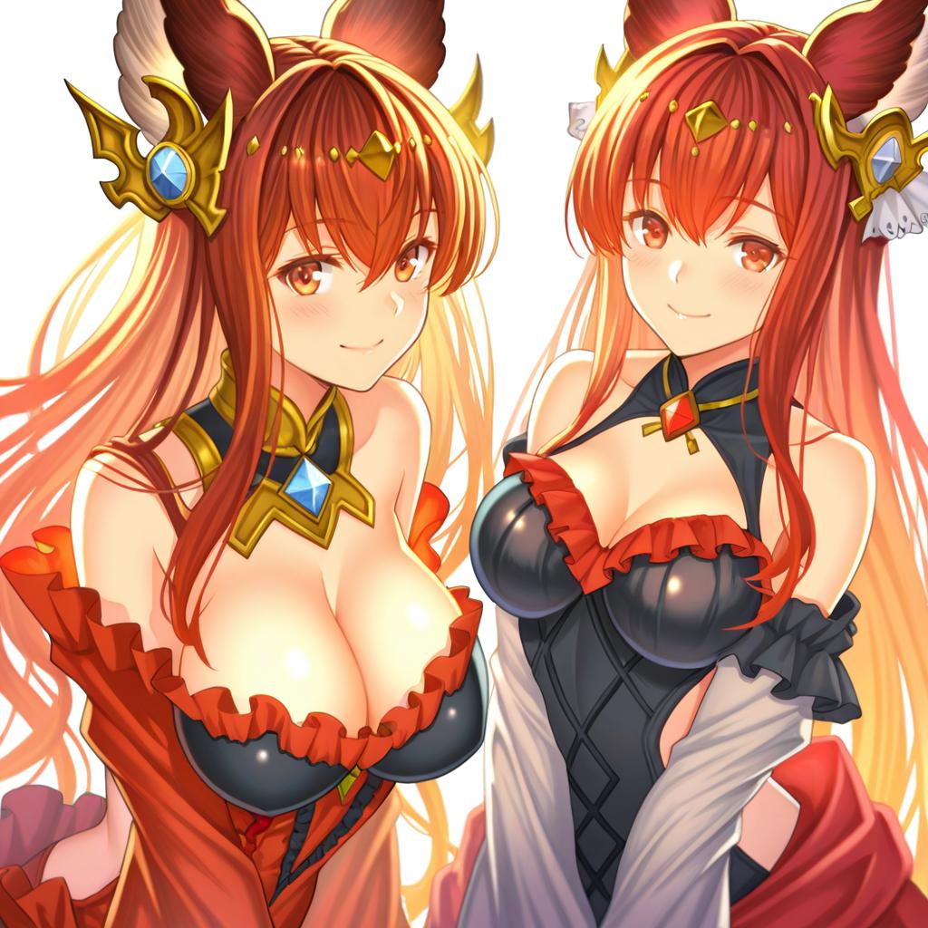 Anthuria, granblue fantasy, 1girl, animal ears, red eyes, hair between eyes, red hair, long hair, hair ornament, medium breasts, large breasts, cleavage, bare shoulders, detached sleeves, erune, by artist jj (ssspulse), illustrious