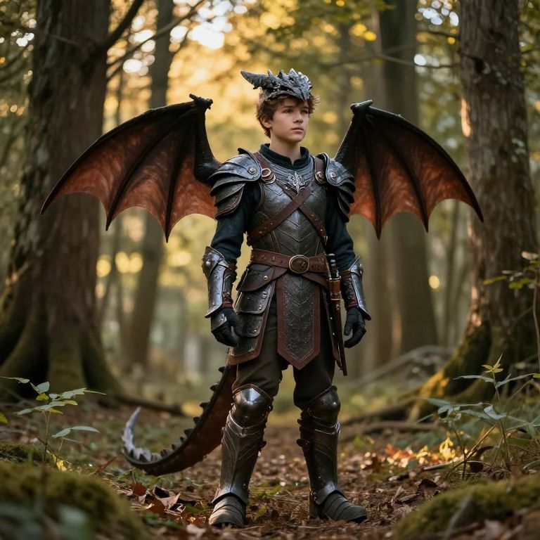 Photorealistic CGI image of a young boy with dragon wings, wearing detailed medieval armor, standing in a sunlit forest path.