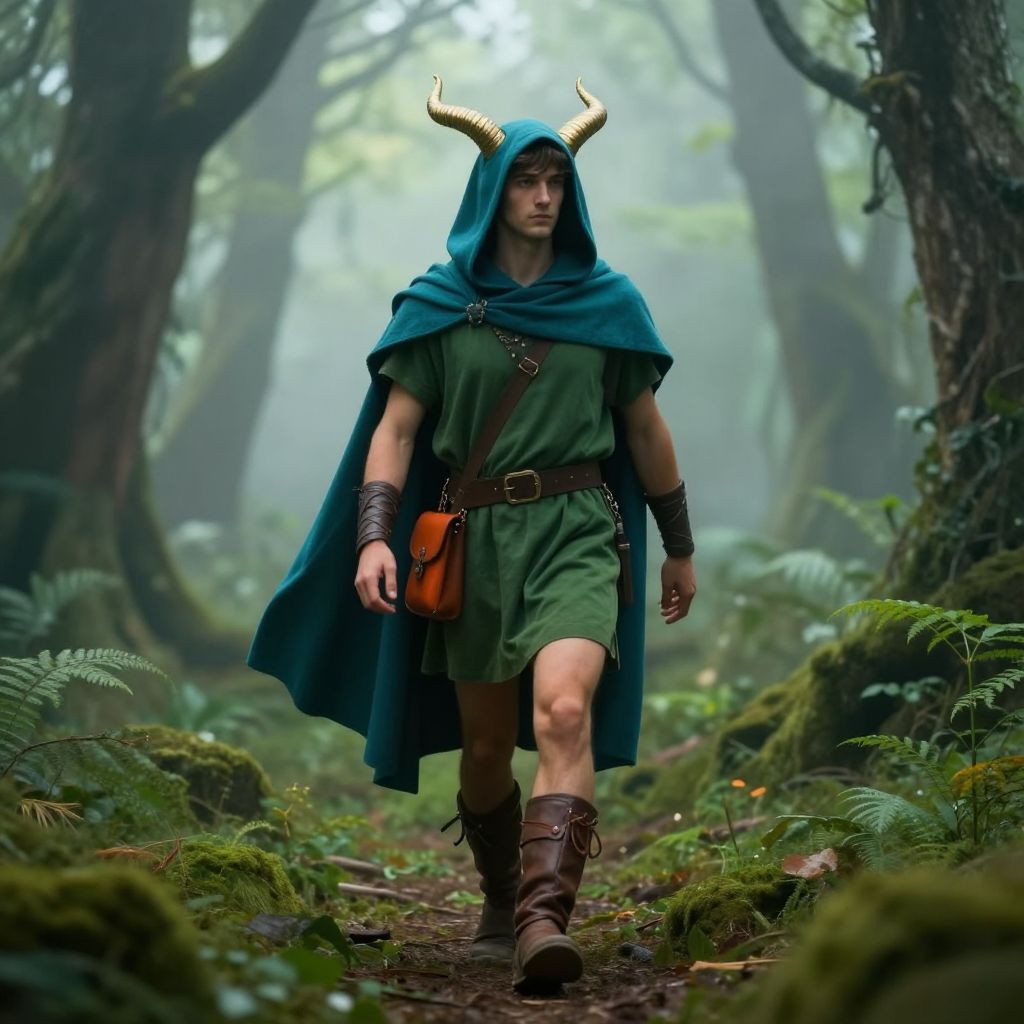 A teenage boy dressed as a fantasy dragon rider, complete with a full-body armor suit, wings, and a leather harness, standing in a forest clearing with tall trees and soft golden hour light filtering through the leaves.