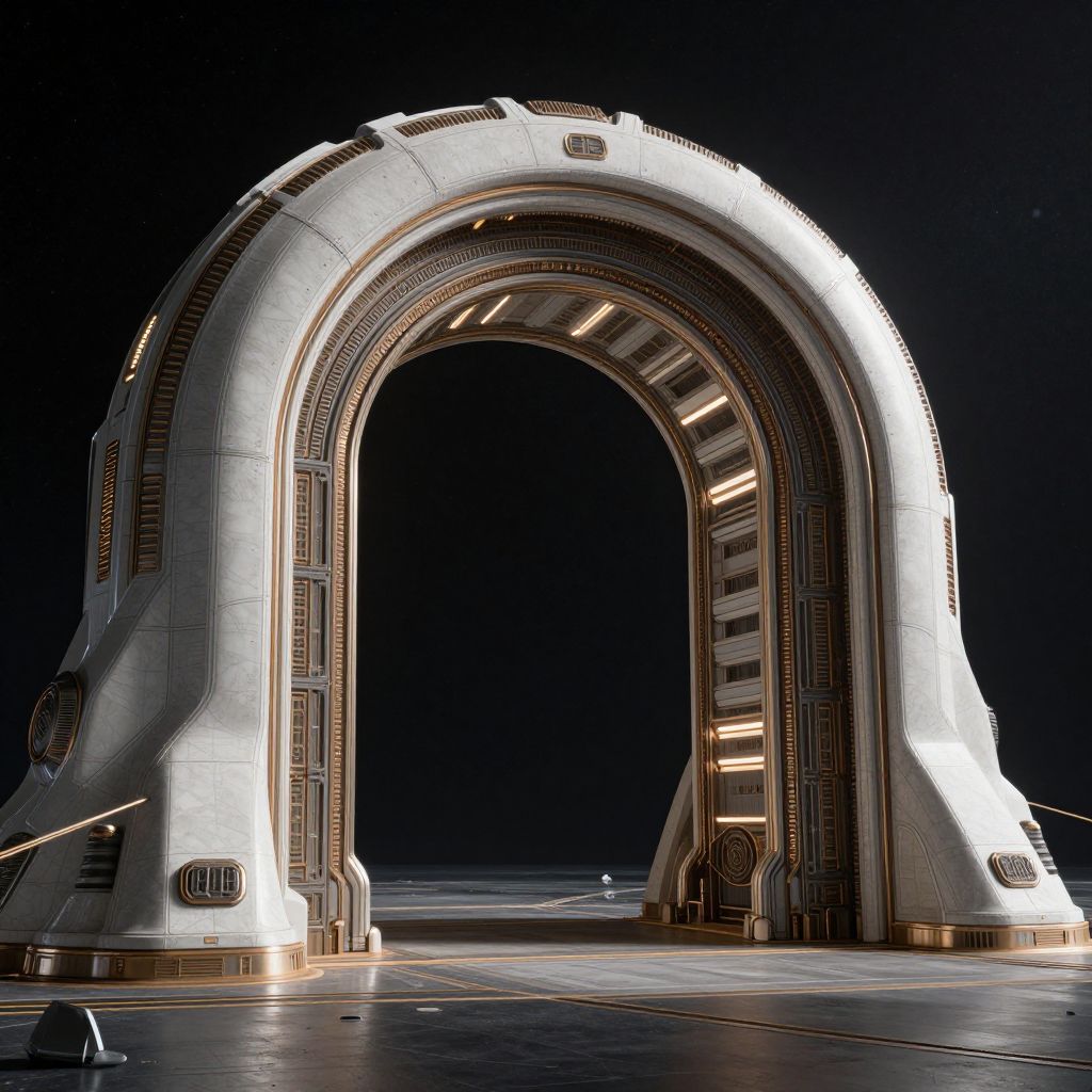 Photograph of a futuristic, white archway structure with intricate, metallic patterns and glowing lights along its sides. The arch is set against a dark, black background, creating a stark contrast. The structure has a sleek, curved design with vertical and horizontal lines, giving it a high-tech appearance. The base of the arch is solid and robust, while the top is more slender. The floor beneath is reflective, showing the arch's underside. The image has a sci-fi aesthetic, emphasizing a sense of advanced technology and space exploration.