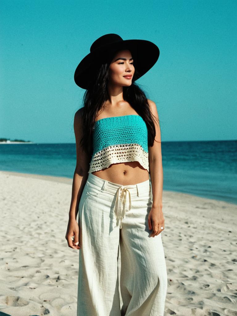 Woman, beach casual, light crocheted cream shawl layered over a turquoise bandeau tank top, white linen wide-leg trousers, wide-brimmed black felt hat.