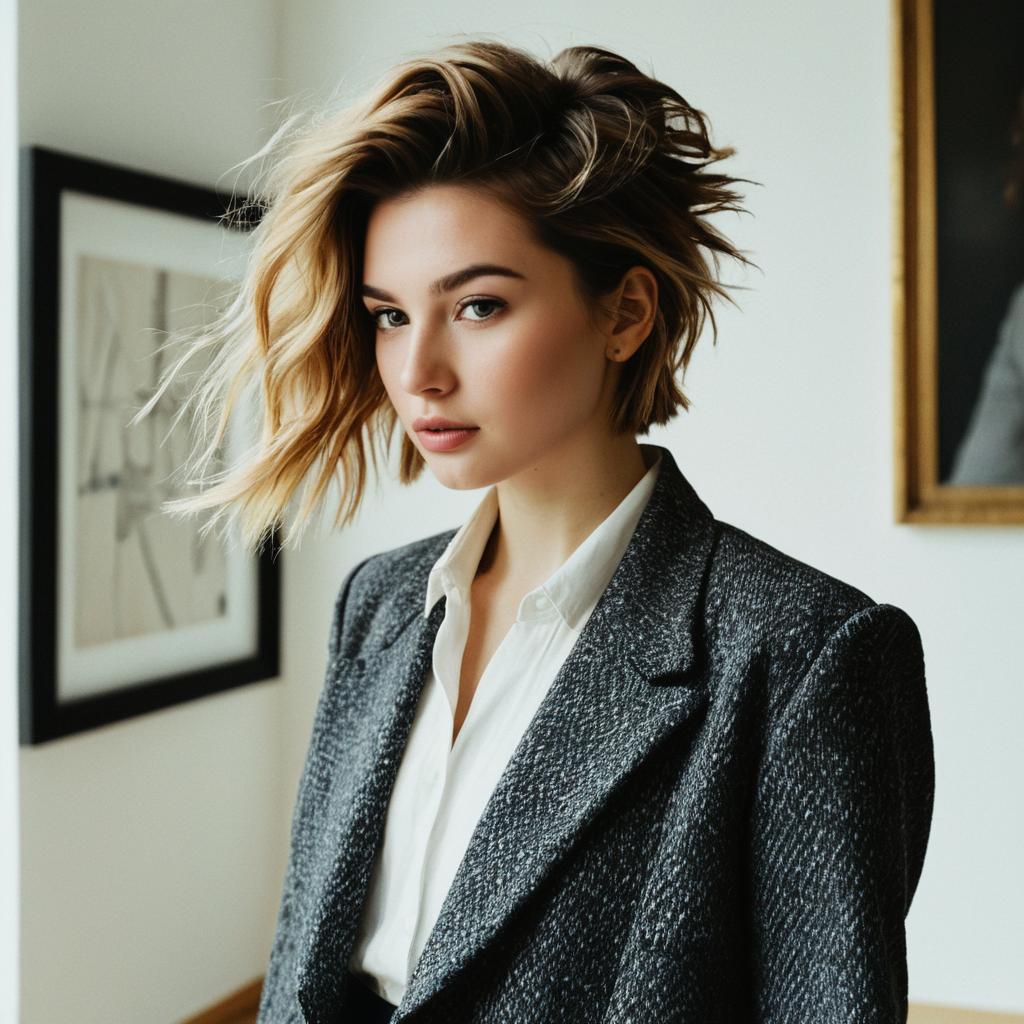 Rose Gold hairstyle on fashion model, wearing sleek jumpsuit, in modern library, captured in fashion editorial style with soft natural light.
